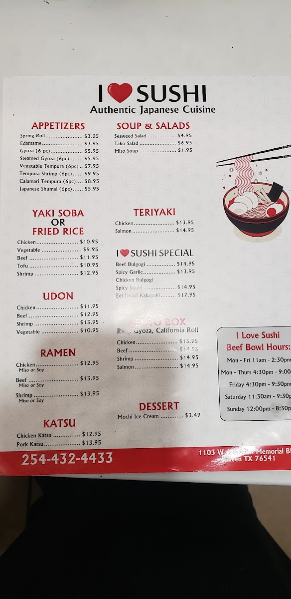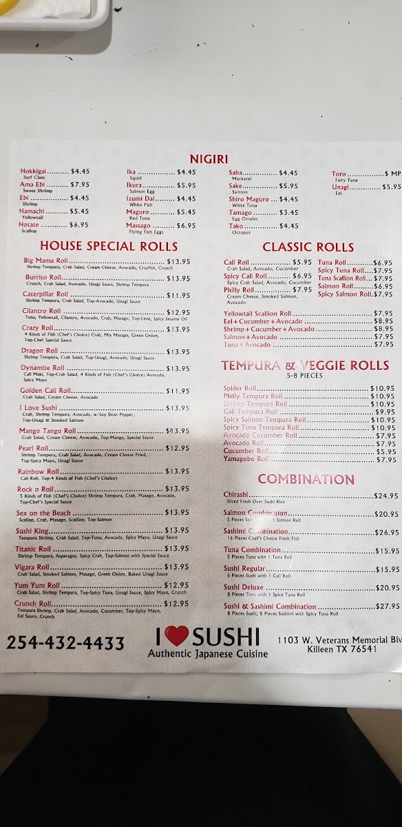 Welcome to I Love Sushi Beef Bowl, a hidden gem located at 1103 W Veterans Memorial Blvd, Killeen, TX. Renowned for its fresh and vibrant offerings, this restaurant invites you to indulge in a delightful menu that features a variety of sushi and sashimi combinations. Try the popular Tuna Combination, boasting five pieces of fresh tuna accompanied by a tuna roll for just $18.95, or opt for the Sushi & Sashimi Combination for a taste of both worlds at $27.95.